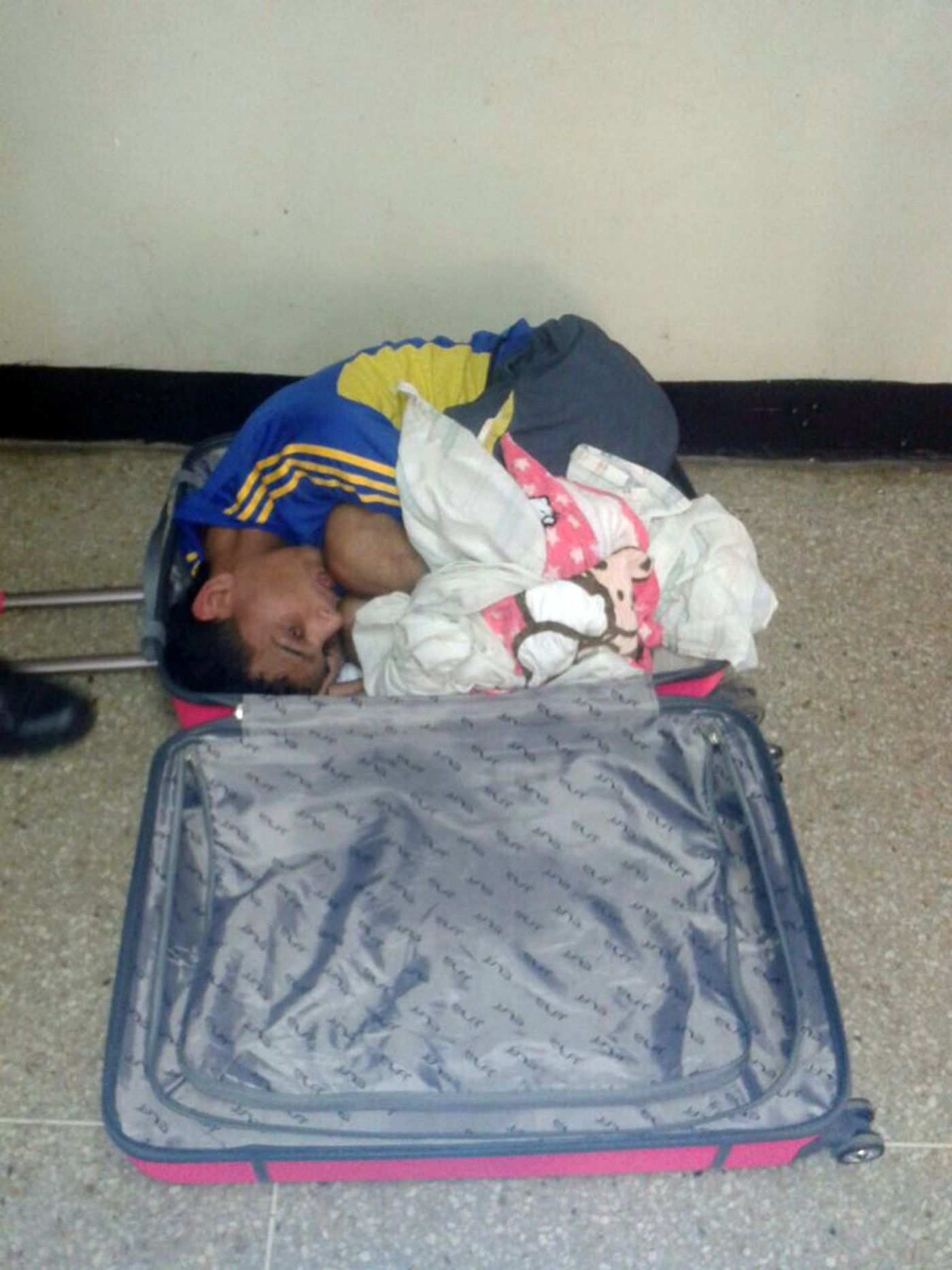 Inside they found her partner who had contorted his body to fit in the suitcase.